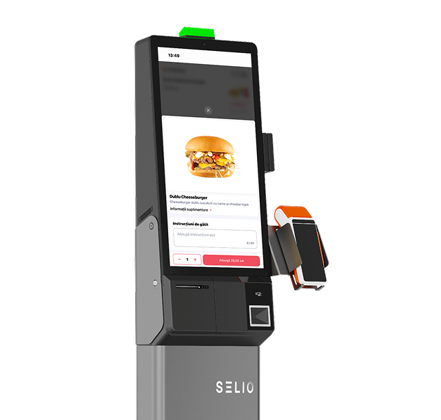Selio Kiosk runs on reliable Android hardware with built-in contactless payments. Designed for fast service, flexible placement, and continuous use in busy restaurants across Romania and the EU.
